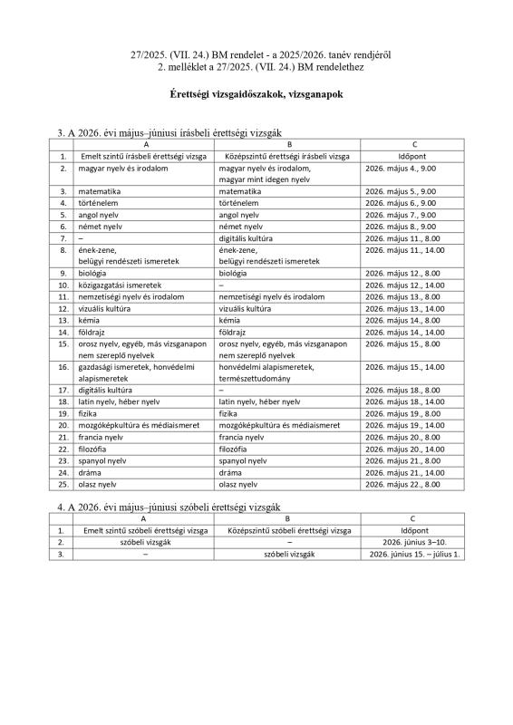 A további érettségi vizsgák és az emeltszintű érettségi vizsgák időpontjai letölthetők a Oktatási Hivatal oldaláról.